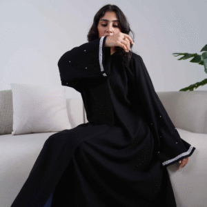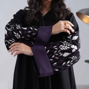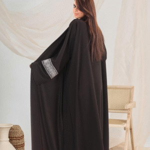عباية رونق تجمع بين الأناقة الكلاسيكية والتفاصيل الفاخرة، بتصميم أسود راقٍ وتطريز هندسي أبيض على الأكمام يمنح لمسة فنية ناعمة.
