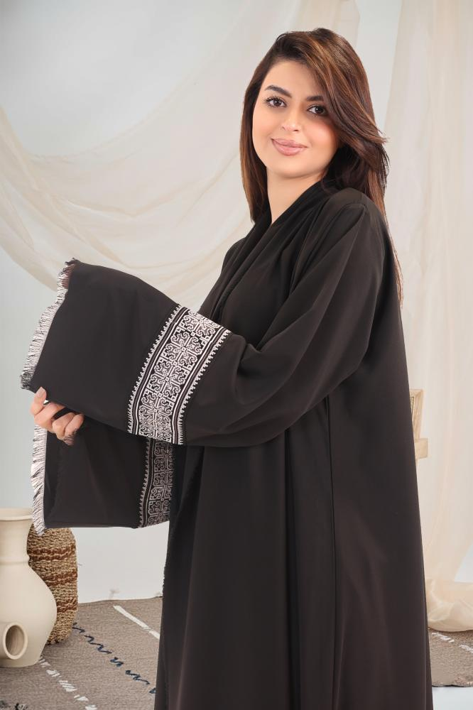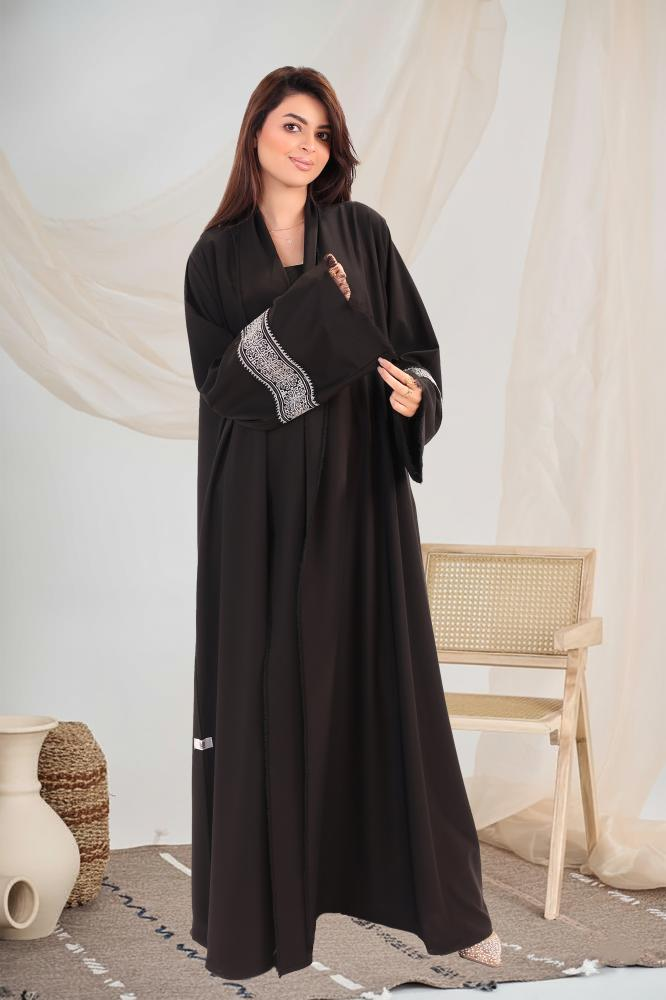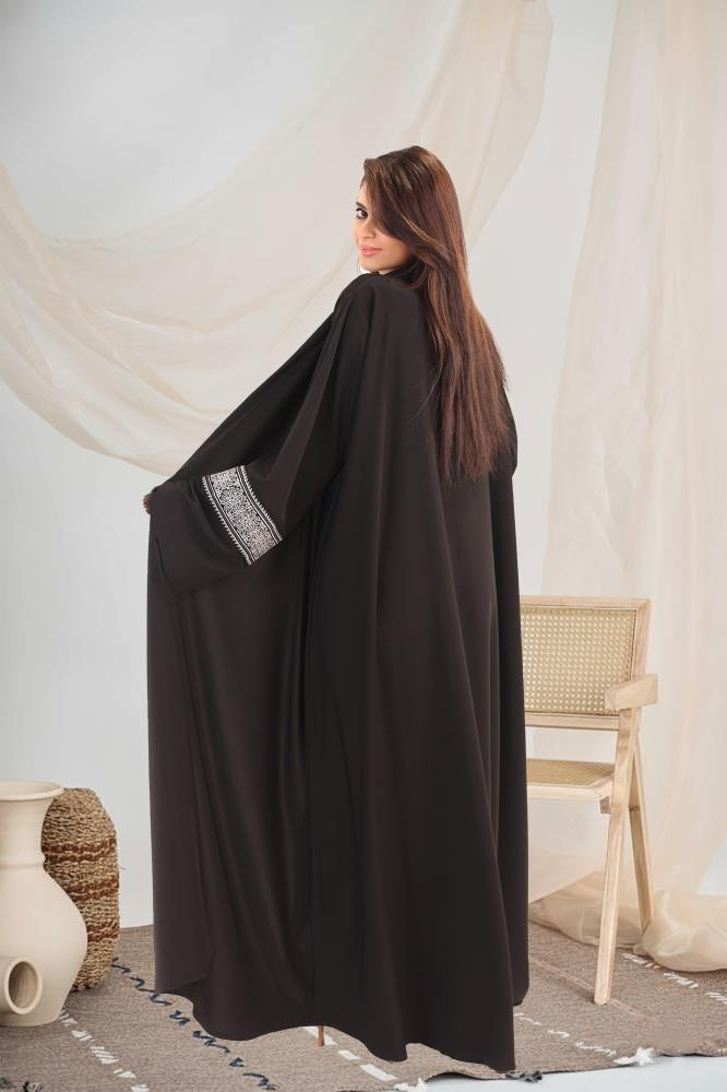 عباية رونق تجمع بين الأناقة الكلاسيكية والتفاصيل الفاخرة، بتصميم أسود راقٍ وتطريز هندسي أبيض على الأكمام يمنح لمسة فنية ناعمة.