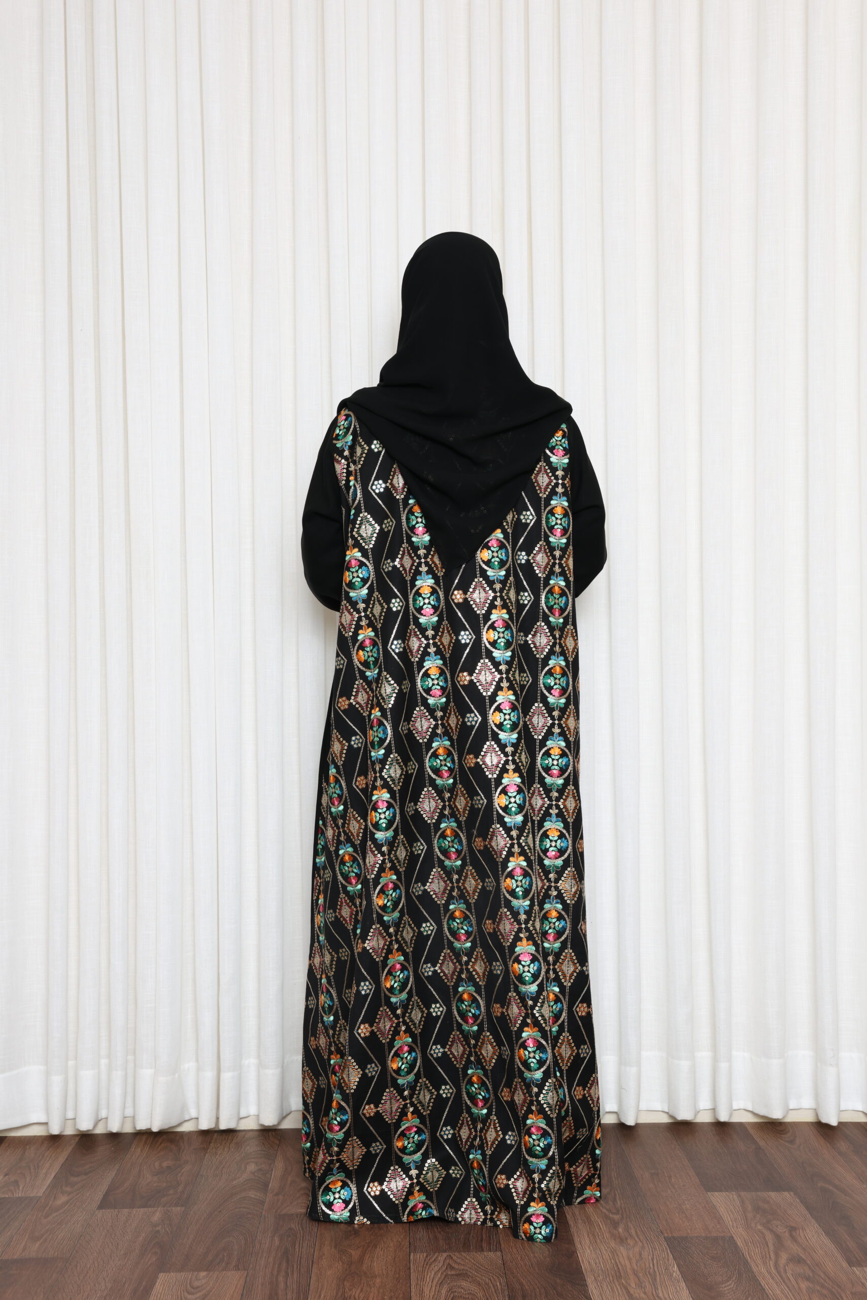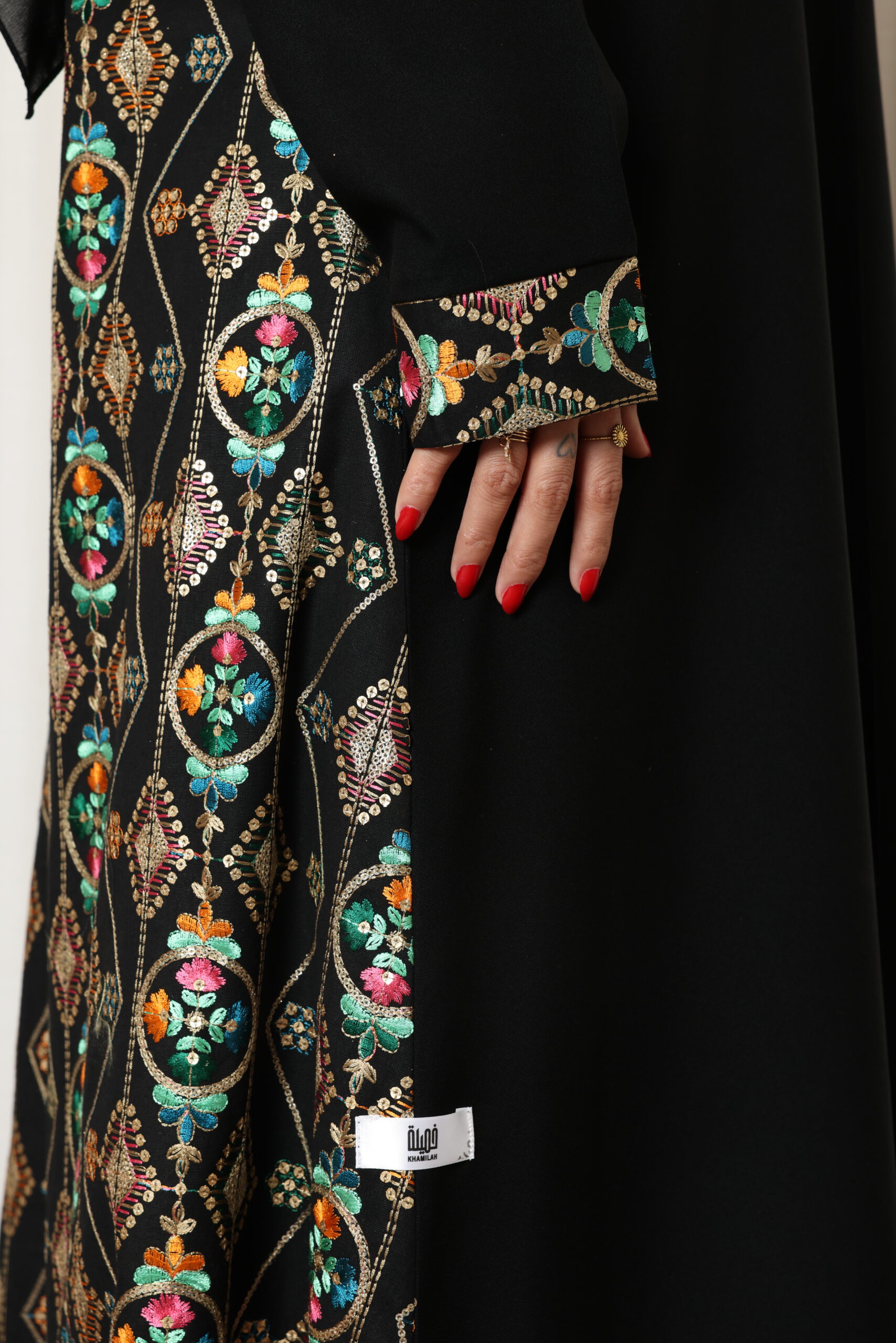 عباية سوداء فاخرة بتصميم راقٍ يجمع بين الفخامة والتميّز، تتميز بتطريز جانبي غني بنقوش متقنة مستوحاة من الطابع التراثي بأسلوب عصري، مع أكمام مزينة بتطريز متناغم يبرز جمال التفاصيل. قصة العباية انسيابية ومريحة تمنح حضورًا أنيقًا يناسب الإطلالات الراقية والمناسبات الخاصة.