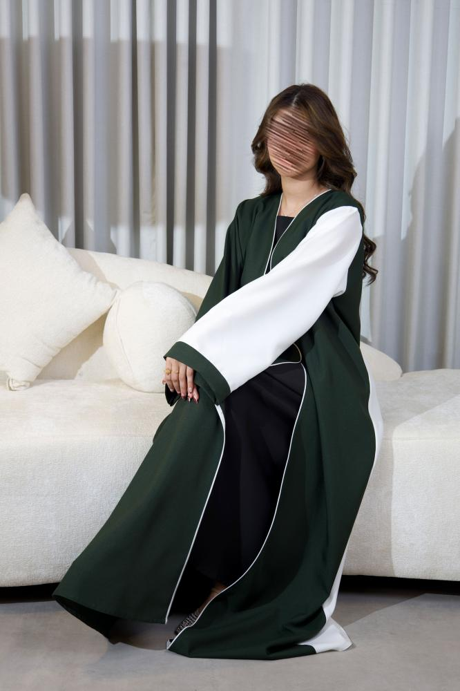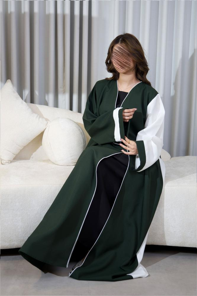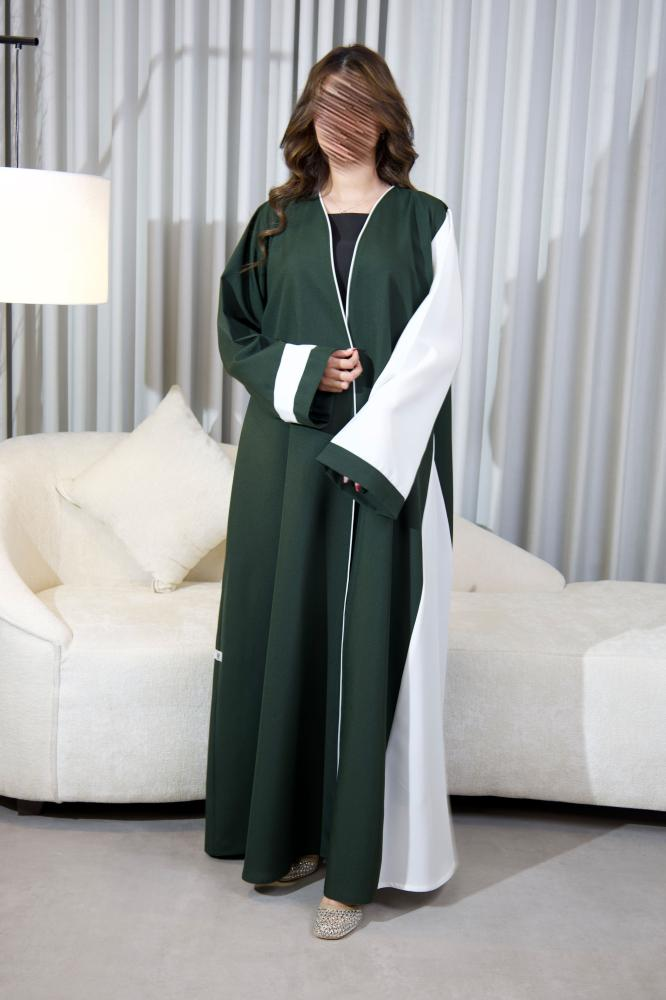 - اللون: أخضر غنيّ يتناغم مع الأبيض المشرق (عباية لون أخضر – عباية خضراء)